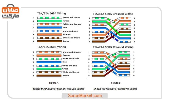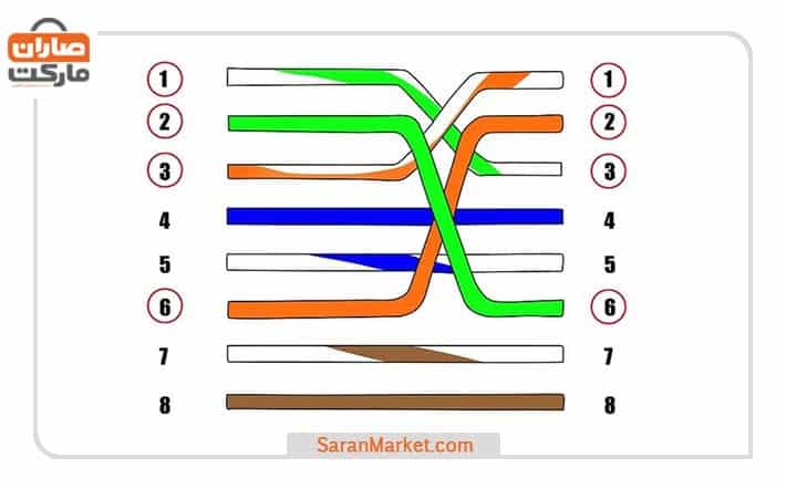 | نوع سوکت زنی | یکسان در هر دو سر (T568A یا T568B) | متفاوت در هر سر (یک سر T568A، یک سر T568B) |