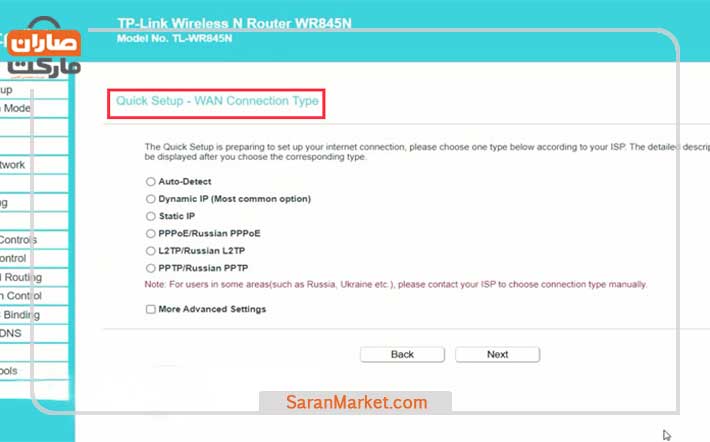 بعد از اینکه توانستید با موفقیت رمز عبور و نام کاربری موردنظر خود را انتخاب کنید، وارد صفحه مربوط به تنظیم روتر تی پی لینک خواهید شد. در مدلهای قدیمی منویی به شما نشان داده میشود. باید وارد پنجره Quick Setup در منو شوید. صفحهای را در مقابل خود خواهید دید که در آن چند گزینه مختلف برای اتصال دارید. شما باید گزینه PPPoE را انتخاب کنید و بعد با زدن دکمه next به مرحله بعد بروید. در انتها کلید save را انتخاب کنید.