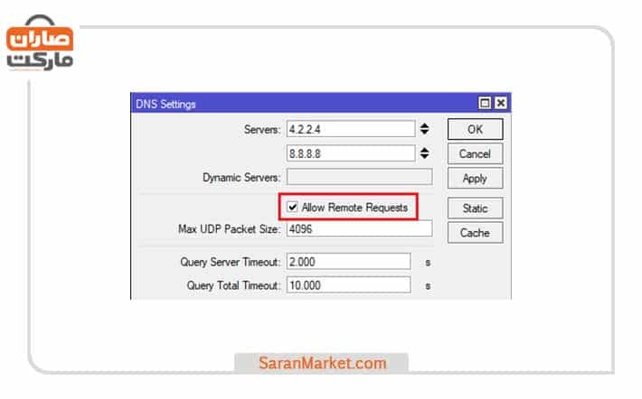 تنظیمات صحیح DNS راهکار دیگری است که کمک میکند افزایش امنیت روتر میکروتیک اتفاق افتد. دقت داشته باشید که عمده حملات به میکروتیکهای دارای IP از طریق همین DNSها اتفاق میافتد. حملات DNS باعث میشود تا پهنای باند بیشتر اشغال شده و مصرف منابع بالاتر برود. جهت جلوگیری از حملات DNS چارهای جز این نیست که Allow Remote Requests را غیر فعال کنید.