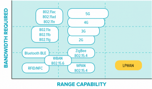 برای ایجاد برد جغرافیایی وسیع، معمولاً از فرکانس زیر 1 گیگاهرتز استفاده میشود. بسیاری از فناوریهای بیسیم از فرکانسهای بالاتر استفاده میکنند، برای مثال زیگبی و وایفای در فرکانس 2.4 گیگاهرتز کار میکنند. هرچه فرکانس کاری افزایش یابد، نرخ افزایش مییابد و در عین حال تضعیف بیشتر خواهد شد. ممکن است در بسیاری از مراجع (از جمله مطالبی که در ماهنامه شبکه منتشر شده است) خوانده باشید که تمایل به فرکانسهای خیلی بالا ـ حتی فرکانسهای در حد چند ده گیگاهرتز ـ رو به گسترش است. این دو رویکرد منافاتی با یکدیگر ندارند و ناشی از دو کاربرد متفاوت هستند: یکی برای ایجاد ارتباط با نرخ بالا در فواصل کم و دیگری برای ارتباط نرخ پایین در فواصل بسیار زیاد. در شکل 1، مقایسهای از نظر پهنای باند (محور عمودی) و برد جغرافیایی (محور افقی) بین فناوریهای مختلف ارتباط بیسیم مشاهده میشود. به جایگاه LPWA در این نمودار دقت کنید. نماد 2G تا 5G شبکههای موبایل نسل دوم تا پنجم را نشان میدهد و 802.11 همان استاندارد وایفای است.