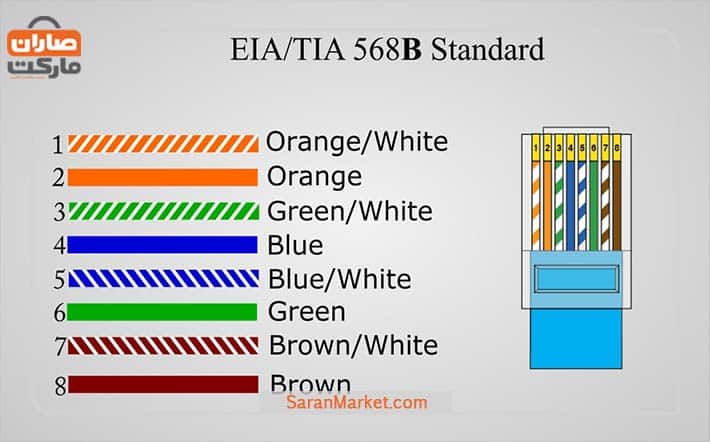 ترتیب قرارگیری سیم‌ ها طبق استاندارد T-568B نیز به شرح زیر خواهد بود: